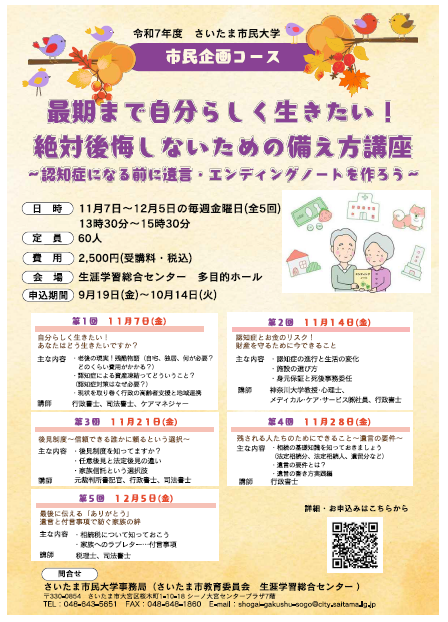 2025年11月7日~12月5日 さいたま市民大学(全5回)『最期まで自分らしく生きたい!絶対後悔しないための備え方講座~認知症になる前に遺言・エンディングノートを作ろう~』チューターとして参加しました